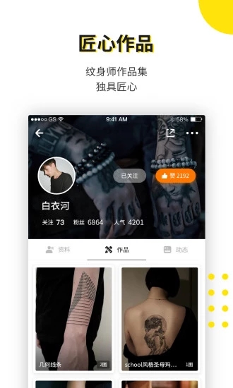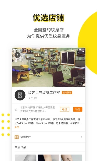 介绍是一款专业的纹身预约和纹身兴趣交流平台,聚集数十万纹身刺青师;纹身爱好者不用再到处寻找适合自己的纹身图案和纹身师。纹什么?纹哪里?去哪纹?找谁纹?纹身多少钱?大咖纹身师遍布全中国200多个城市,已有超过300000名纹身师在这里聚集,已有5000000纹身爱好者在这里找到他们的纹身师,是国内最大的纹身刺青原创作品与兴趣爱好交流平台,app免费开通纹身师个人作品集!免费下载纹身手稿图案素材!爱好者在线预约纹身大师!纹身爱好者不用再到处寻找适合自己的纹身图案和纹身师!纹身师不用在贴吧、陌陌、空间刷广告接单,APP致力于打造最完善的纹身互动交流社区平台,只要你对这个行业感兴趣有基础,你也可以上传你的作品,供大家一起学习谈论交流。