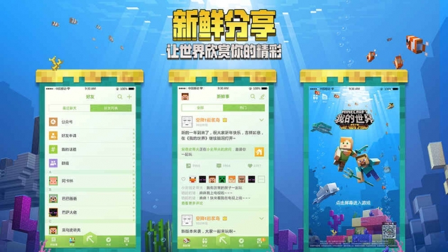 无论是难忘的冒险经历,还是自豪的创造作品,新鲜事功能帮你通过文字与图片记录所有的游戏成就。与好友分享发现你收获第一块钻石的喜悦、建成第一座小屋的感动。@好朋友一同加入,把你的故事分享给整个世界。另外,也可以分享新鲜事、好友、游戏至外部APP,让更多人看到你的精彩!