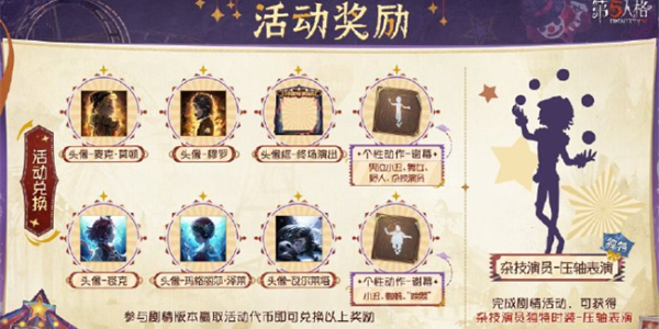 活动代币还可兑换喧嚣马戏团里各个角色的个性动作、头像、头像框等奖励。完成剧情活动后,还可获得【独特时装】杂技演员-压轴表演。