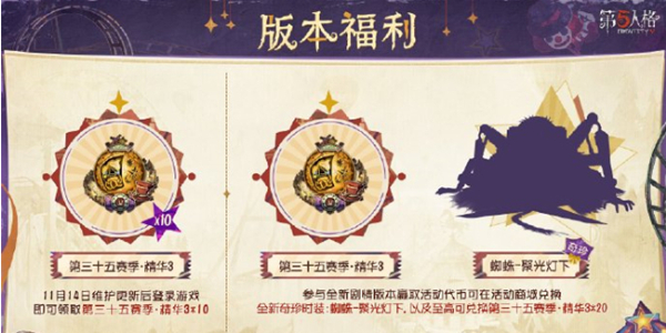 在本次剧情版本活动期间,访客们登录游戏分享本次活动,即可领取【第三十五赛季·精华3】×10。另外,参与全新剧情版本,还可以赢取活动代币,在活动商城里兑换最多20连【第三十五赛季·精华3】以及【奇珍时装】蜘蛛-聚光灯下!