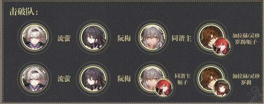 流萤击破队:流萤+同谐主+阮梅+灵砂/加拉赫,增益效果:噱头。