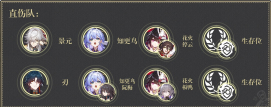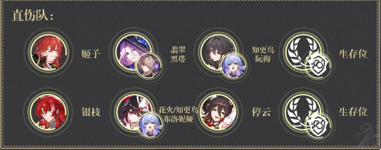 直伤队:姬子+黑塔/翡翠+阮梅/知更鸟+生存位,增益效果:噱头。