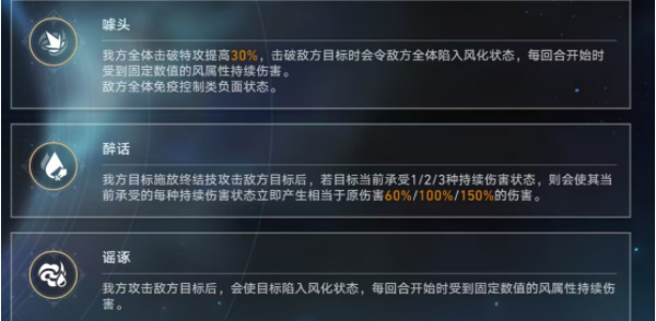 我方全体击破特攻提高30%,击破敌方目标时会令敌方全体陷入风化状态,每回合开始时受到固定数值的风属性持续伤害。