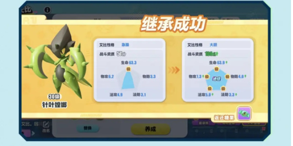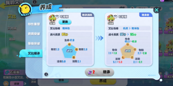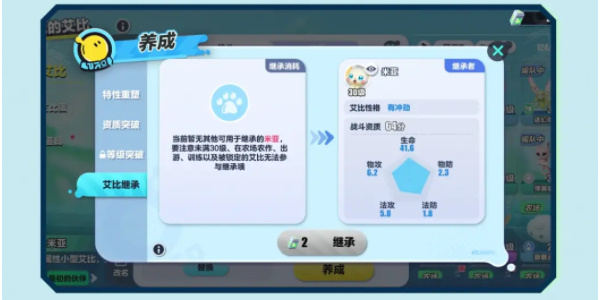 使用艾比继承系统,需要消耗特定道具“继承器”。玩家可以选择自己喜欢的艾比作为继承者,其同种族的艾比均可作为被继承者,被继承者的资质和性格将会完全复制到继承者身上。
