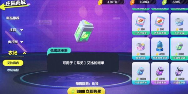 玩家在农场商店中可以使用艾比特性水晶兑换继承器,水晶不足也不用担心,继承器后续也会在艾比商城中上架。