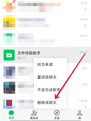 5、最后回到微信消息页面,我们长按【文件传输助手】就会弹出菜单,我们点击菜单中的【删除该聊天】这样就可以使其退出微信消息页面。