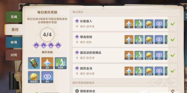 每日委托可以快速提示世界等级。游戏中每天都有四个委托可以完成,完成委托可以获得大量的冒险阅历,并且完成四个委托后还有额外的原石奖励。
