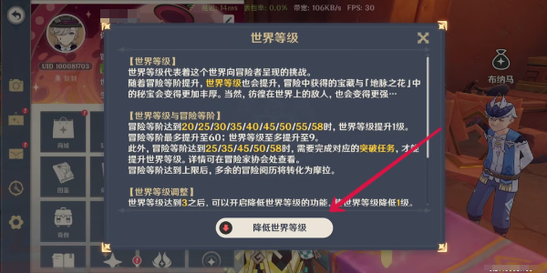 2、然后在弹出的窗口中点击【降低世界等级】即可。