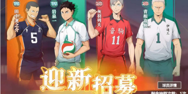 新手池的SSR角色:「田中龙之介」、「岩泉一」、「灰羽列夫」、「青根高伸」。