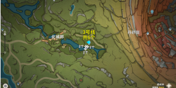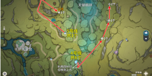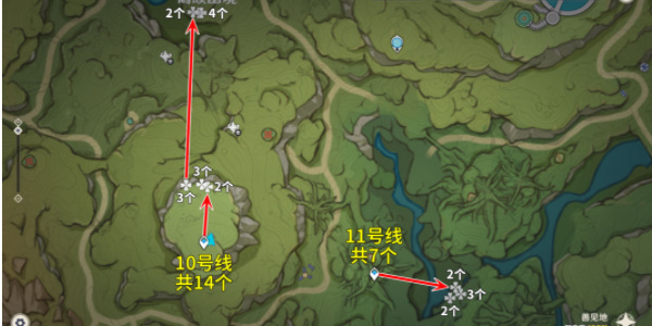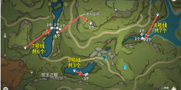 7、水天丛林和谒颂幽境,共21个,采集路线如下图所示。