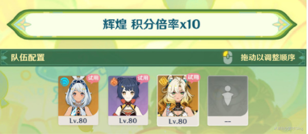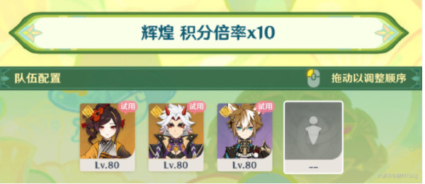 玩家积分倍率调至十倍,携带角色基尼奇(试用)、艾梅莉埃(试用)、托马(试用)、香菱/班尼特,打绽放燃烧反应。