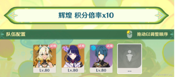 推荐阵容:积分倍率调至十倍,携带三个试用角色希诺宁、雷电将军、行秋,然后自己可以选择带班尼特或香菱,组成雷神国家队。