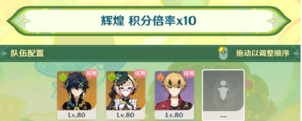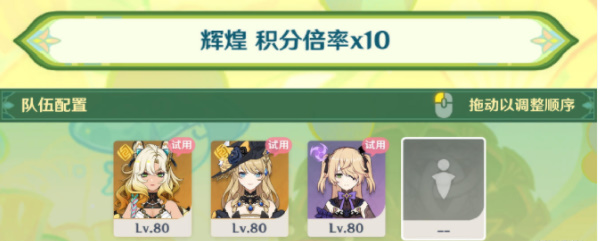 将积分倍率调至十倍,推荐阵容为希诺宁、玛拉妮、香菱,琳妮特/万叶,其中希诺宁、玛拉妮、香菱是试用角色。