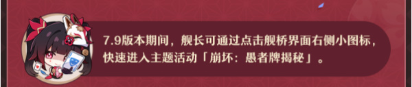 7.9版本期间,舰长可通过点击舰桥界面右侧小图标,快速进入主题活动「崩坏:愚者牌揭秘」。