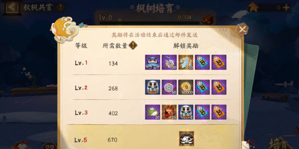 4、活动期间,阴阳师至少向同一个阴阳寮捐赠240个【秋韵红叶】,即可在活动结束后获得对应等级的寮秘宝奖励。