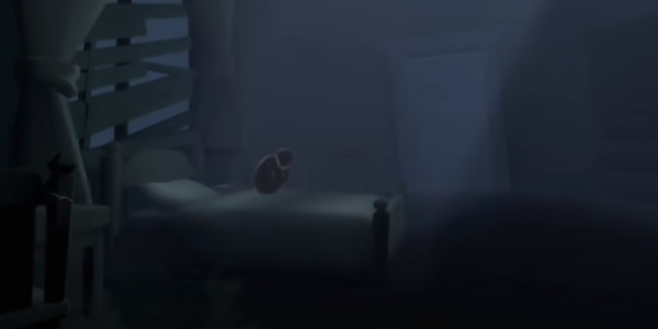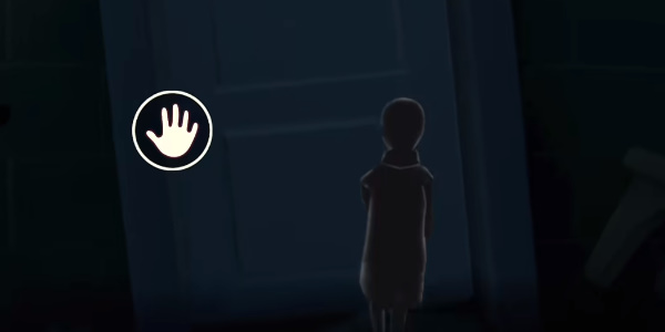 6、进入迷宫后我们直接从床上下来,然后来到面前的这扇门旁边,点手掌互动,就可以把门打开。