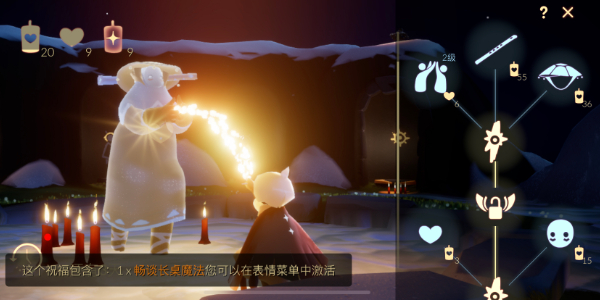 需要先解锁先祖主干到最上面的魔法祝福,随后用55根追光季蜡烛兑换。