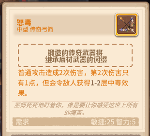 传奇特效:普通攻击会造成2次伤害,第二次伤害只有1点,但会使敌人获得1~2层中毒。