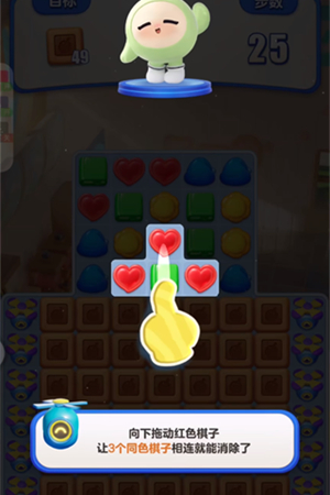 4、在关卡界面当中会存在着当前关卡的目标,以及相关提示,挑战中需要通过滑动棋子来进行消除的操作。