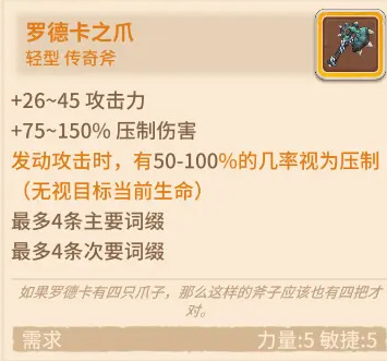 传奇特效:发动攻击时,有50—100%概率视为压制,无视目标当前生命。