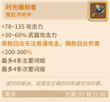 传奇特效:奇数回合无法普通攻击,偶数回合伤害增加200—300%。