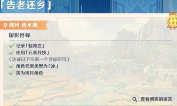 原神画外旅照第四天告老还乡是游戏中4.8版本新增的一个拍照任务,是属于浮露之章系列任务之一,需要玩家前往璃月的碧水原区域完成留影目标即可完成,接下来小编会为大家带来原神画外旅照第四天告老还乡攻略。