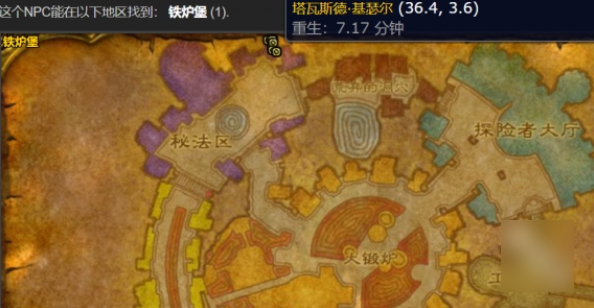 当清洁工作完成之后,我们需要去找 NPC 塔瓦斯德·基瑟尔,其位置位于铁炉堡秘法区坐标的 36.4,3.6 处。